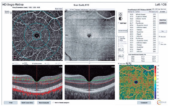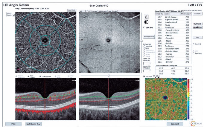 We used the OCTA scans to evaluate the foveal avascular zone area and the SCP and DCP vascular densities in the foveal, parafoveal, and perifoveal zones; areas 1 and 6 mm in diameter were used to calculate the flow distribution in the choriocapillaris for each patient at each visit. A split-spectrum amplitude-decorrelation angiographic software algorithm was used to construct a flow map of each scan. The motion correction technology incorporated in the Optovue software was used to compensate for motion artifacts.