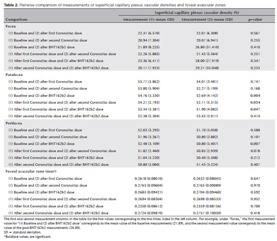 Gedik et al. studied 40 healthy individuals who received a single dose of the CoronaVac vaccine and compared OCTA images taken before and 1 week after vaccination. They also examined the vascular parameters of the macula and optic disc. They observed a general decrease in vascular densities of the SCP, DCP, and peripapillary region, but the changes were not statistically significant(16). These results supported those of our study because in comparing OCTA measurements before and after the first dose of inactivated vaccine, we found a statistically insignificant decrease in macular and subfoveal choroidal flow, and this decrease reached a significant level in most macular parameters after the second dose.