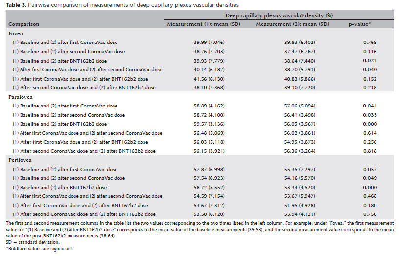 The decrease in vascular densities of the retinal capillary plexuses and choroidal flow was more evident after inactivated vaccine doses. Pichi et al. reported possible ophthalmologic manifestations, including chorioretinal ischemic disorders such as AMN and paracentral acute middle maculopathy, after receipt of an inactivated COVID-19 vaccine(14). These effects have also been observed with other types of inactivated vaccines. Liu et al. showed a decrease in DCP vascular density on OCTA when AMN was developing after receipt of inactivated influenza vaccine(15).