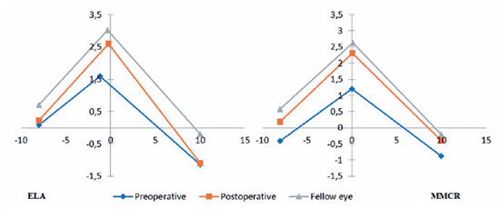 The y coordinates of the marginal peak points of pre- and postoperative ptotic eyelids and non-ptotic fellow eyelids were 1.59 mm, 2.6 mm, and 3.01 mm in the ELA Group and 1.2, 2.31, and 2.62 in MMCR Group respectively. The y coordinates of the marginal peak points were changed significantly by both the ELA and MMCR techniques (p=0.002 and p<0.001, respectively), and became significantly close to those of the non-ptotic fellow eyelids (p=0.27 and p=0.2, respectively). The x coordinates of the marginal peak point of pre-and postoperative ptotic eyelids and non-ptotic fellow eyelids were −1.18 mm, −0.24 mm, and −0.32 mm respectively in ELA and 0.03, 0.07, and 0.09 mm respectively in the MMCR Group. In the ELA Group, the marginal peak point was more nasally placed in the preoperative ptotic eyelids than with the non-ptotic fellow eyelids (−1.18 vs. −0.32 mm), and a temporal shift in the x coordinate of the peak point was achieved by ELA surgery (from −1.18 to −0.24 mm). This shift, however, was not significantly important (p=0.11). In contrast, the x coordinates of the marginal peak points in the MMCR Group were in a similar range. Both surgical techniques achieved similar postoperative x measurements in comparison to non-ptotic fellow eyelids (p=0.36, p=0.49, respectively) (Table 2).