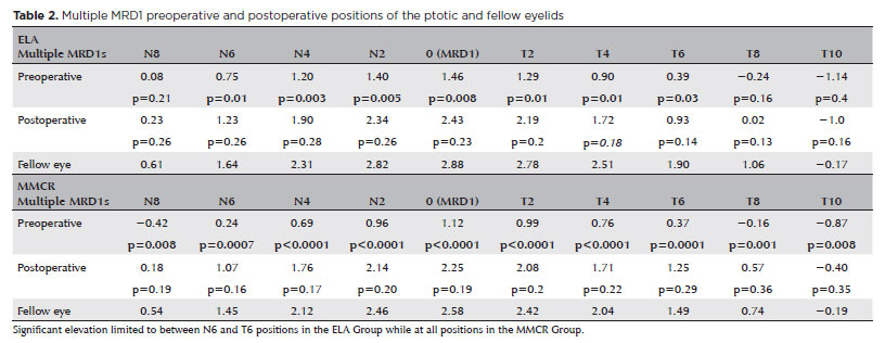 In the ELA and MMCR Groups, the mean MRD1 values of ptotic eyelids were 1.46 ± 1.45 mm and 1.12 ± 0.74 mm, respectively, preoperatively. Postoperatively, they were 2.43 ± 1.23 mm and 2.25 ± 0.72 mm, respectively. The mean MRD1 values of the non-ptotic fellow eyelids in the ELA and MMCR Groups were 2.88 ± 1.69 mm and 2.58 ± 0.94 mm, respectively. Both surgical techniques resulted in significant improvements in MRD1 values (p=0.008 and p=0.0001, respectively), with the postoperative values in both groups being close to those of the non-ptotic eyelids (p=0.23 and p=0.19, respectively).