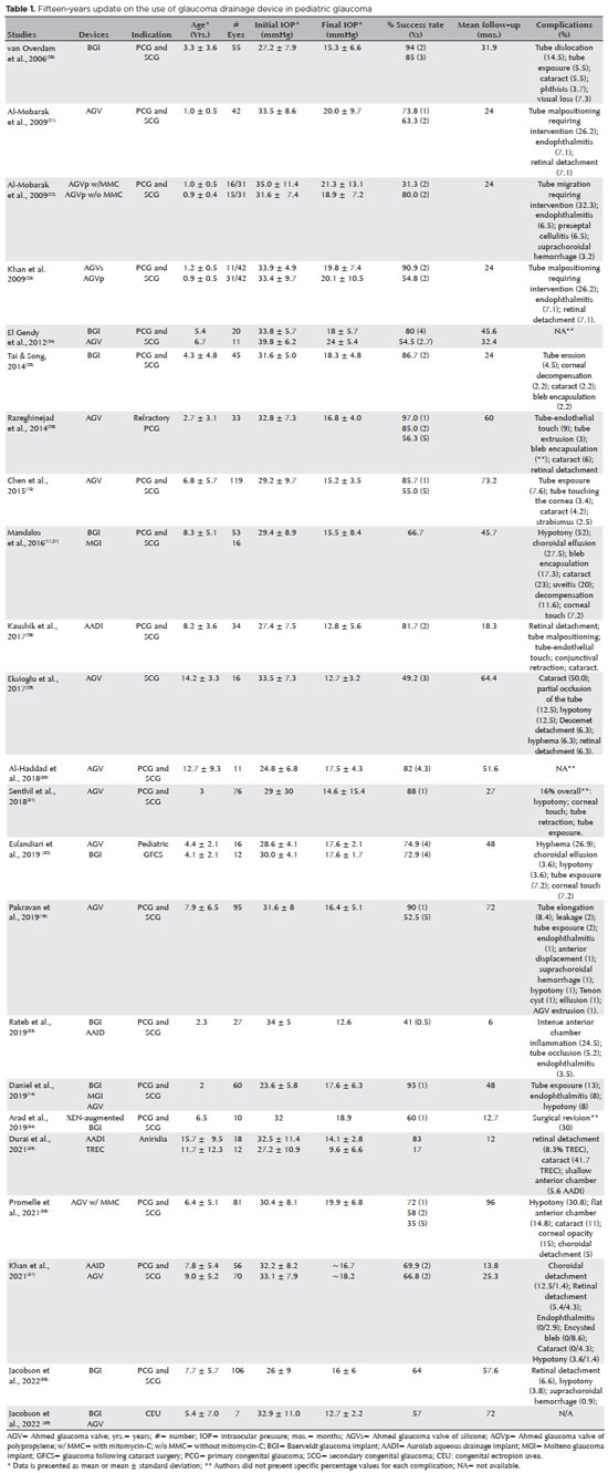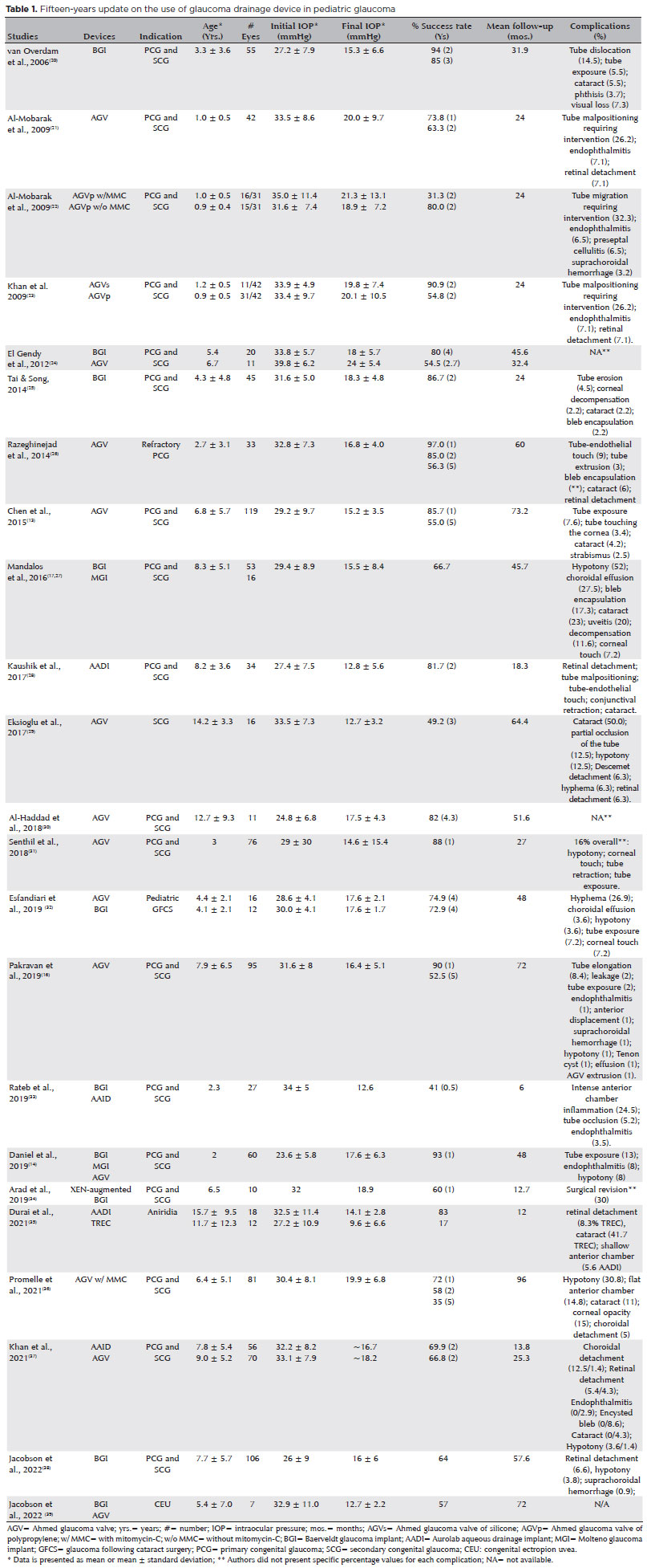 Data pertaining to the following variables were compiled: age of children at the time of GDD implantation; number of eyes operated; initial and final IOP, success rate, follow-up period (months), and complications. All the authors of this review participated in the literature selection as well as in the analysis and redaction of the work.