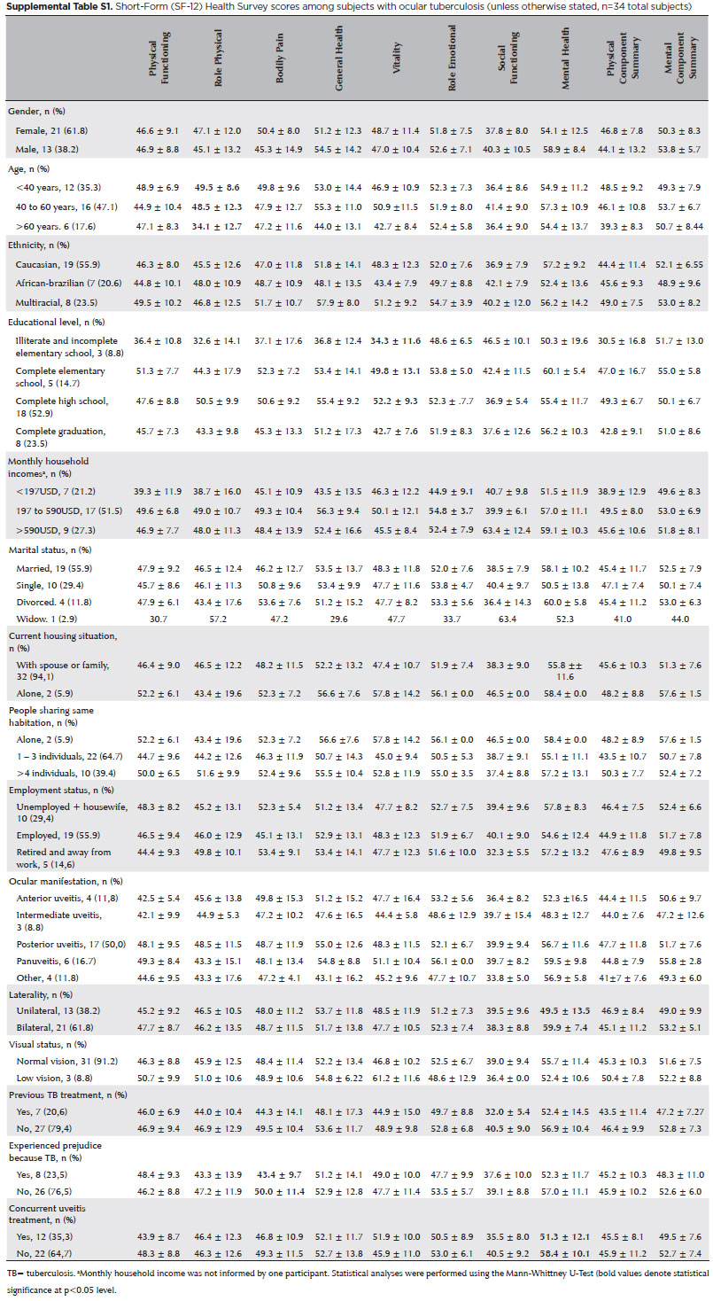 Clinical and sociodemographic characteristics were significantly associated with some domains (p<0.05): (a) older age was associated with the reduced role physical score; (b) lower monthly household income was associated with the reduced role emotional score; (c) patients with a unilateral disease had lower mental health scores; (d) undergoing previous TB treatment was associated with a lower social functioning score; (e) patients experiencing prejudice because of TB had lower bodily pain scores; and (f) patients receiving concurrent treatment for uveitis had lower mental health scores (Supplemental data - S1).