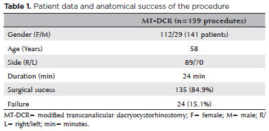 METHODS: This study, conducted from January 17 to June 2022, encompassed 141 patients (159 procedures) who underwent modified transcanalicular diode laser dacryocystorhinostomy (MT-DCR). The procedure employed an 810-nm diode laser. Patients were monitored for at least a year after the intervention. Anatomical success was determined by ostium patency upon irrigation, while functional success referred to epiphora resolution. Parameters studied included patient demographics, procedure duration, complications, and both anatomical and functional success. Statistical analysis was performed using the Statistical Package for the Social Sciences software, with results considered significant at a 95% confidence interval (p≤0.05).