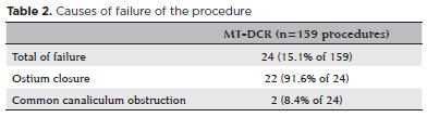 Generally, MT-DCR success rates are lower than those of traditional external and endoscopic DCR. However, due to its minimally invasive nature and short operative time, MT-DCR could be a preferred choice for certain ophthalmologists, especially for young patients without intranasal pathology and coagulation disorders and for elderly patients at risk during general anesthesia. In MT-DCR, effective bleeding control, short operative time, and low laser power are key factors in achieving high success rates(8-12).