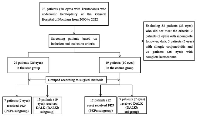 The data of patients with keratoconus at the scar or edema stage who underwent keratoplasty (PKP or DALK) at the General Hospital of Northern Theater Command during 2000-2022 were retrospectively collected. The patients were divided into the scar group (PKPa subgroup and DALKb subgroup) and edema group (PKPc subgroup and DALKd subgroup) (Figure 1). This study was approved by the Ethics Committee of the General Hospital of Northern Theater Command (Y(2022)134) and conducted in accordance with the Declaration of Helsinki. Informed consent of the patients was waived off owing to the retrospective nature of the study.