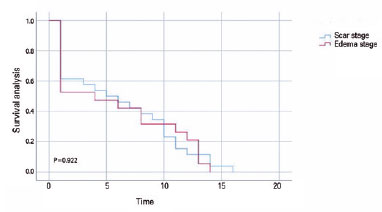 Excluding loss of follow-up and changes in visual acuity due to reasons unrelated to disease and surgery, the time from postoperative to LogMAR visual acuity ≤0.3 was measured. There were 45 patients, with 26 in the Scar Group and 19 in the Edema Group. According to the log-rank test, there was no statistically significant difference between the prognosis of patients at different stages (p=0.922). The Kaplan-Meier curve demonstrates that patients in the Scar and Edema Groups have significantly improved vision following corneal transplantation. LogMAR of all patients reached 0.3 within 20 months, and 50% of patients in the Scar and the Edema Groups reached this visual acuity at 5 and 4 months, respectively. This indicates that the visual acuity of the Edema Group improved faster than that of the Scar Group (Figure 2).