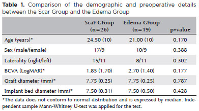 The study involved 45 patients (45 eyes), of which 26 patients (26 eyes) were in the Scar Group and 19 patients (19 eyes) were in the Edema Group. Seven patients (7 eyes) received PKP (PKPa subgroup), while 19 patients (19 eyes) received DALK (DALKb subgroup) from the Scar Group. In the Edema Group, PKP was administrated to 12 patients (12 eyes) (PKPc subgroup), and DALK was administered to 7 patients (7 eyes) (DALKd subgroup). Age, sex, preoperative best-corrected visual acuity, graft diameter, and implant bed diameter did not significantly differ between the two groups (p>0.05) (Table 1).
