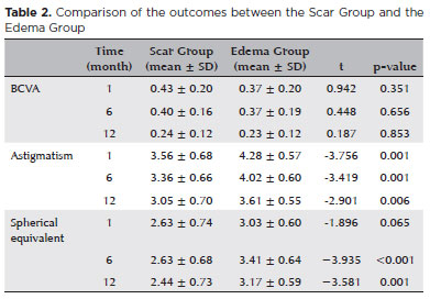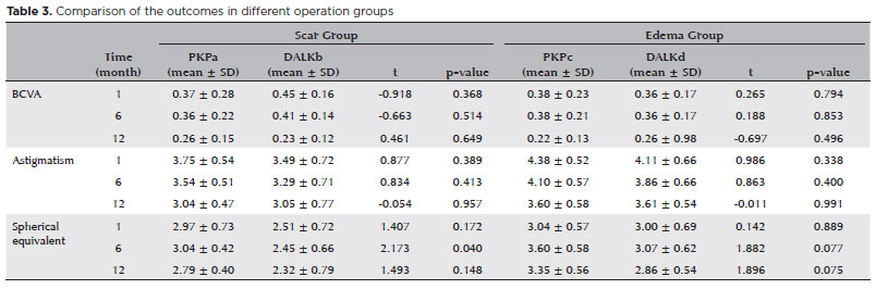 RESULTS: The best-corrected visual acuity and average corneal endothelial cell loss rate were not significantly different between the scar and edema groups (p>0.05). At 6 and 12 months after surgery, the astigmatism and spherical equivalent in the scar group were significantly lower than those in the edema group (p<0.05). The spherical equivalent of the deep anterior lamellar keratoplasty b subgroup was lower than that of the penetrating keratoplasty a subgroup in the scar group 6 months after surgery (p<0.05). In the edema group, there was no significant difference in spherical equivalent between subgroups (p>0.05). There were no significant differences in best-corrected visual acuity and astigmatism between subgroups within the two groups (p>0.05). In comparison to the scar group, the edema group experienced more complications. According to a survival analysis, there was no statistically significant difference between the scar group and the edema group regarding the progression of vision.