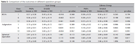 A month after surgery, there was no significant difference between the Scar and Edema Groups (p>0.05). The spherical equivalent of the Scar Group was significantly lower than that of the Edema Group 6 months and 12 months following surgery (p<0.05) (Table 2). The spherical equivalent of the PKPa Group in the Scar Group was significantly higher than that in the DALKb Group (p<0.05) 6 months after surgery. No statistically significant difference occurred in the 1 and 12 months following surgery. In the Edema Group, there was no statistically significant difference between the PKPc and the DALKd subgroups at any given time (Table 3).