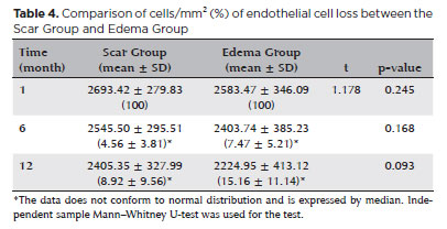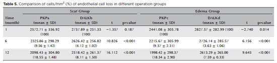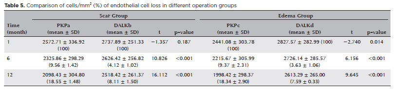 There was no significant difference in the mean endothelial cell loss rate between the Scar Group and the Edema Group 6 and 12 months following surgery (p>0.05) (Table 4). At 6 and 12 months following surgery, the mean endothelial cell loss rate in the PKPa subgroup was significantly higher than in the DALKb subgroup (p<0.001). At 6 and 12 months following surgery, the mean endothelial cell loss rate in the PKPc subgroup was significantly higher than that in the DALKd subgroup at 6 and 12 months after operation (p<0.001) (Table 5).