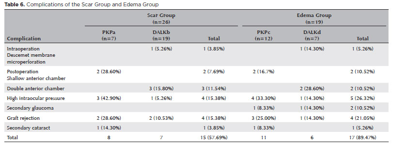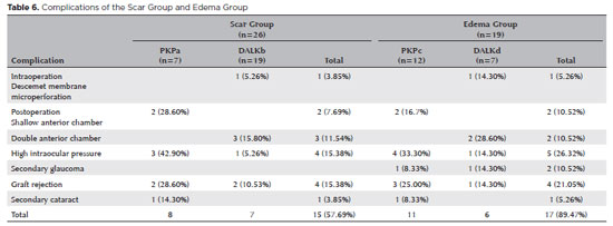 In the Scar Group, complications affected 15 eyes (57.69%), while in the Edema Group, complications affected 17 eyes (89.47%) (Table 6). There were only intraoperative complications in the DALKb and the DALKd subgroups.