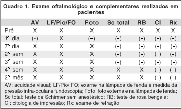 Após esta, foi realizado a medida da acuidade visual, biomicroscopia à lâmpada de fenda, pressão intra-ocular, foto na lâmpada de fenda, oftalmoscopia indireta, teste de Schirmer sem anestésico, teste da coloração por rosa bengala a 1%, e citologia de impressão da conjuntiva bulbar inferior (Quadro 1).