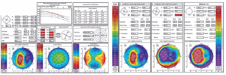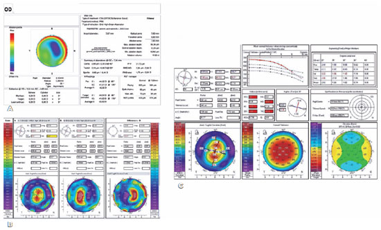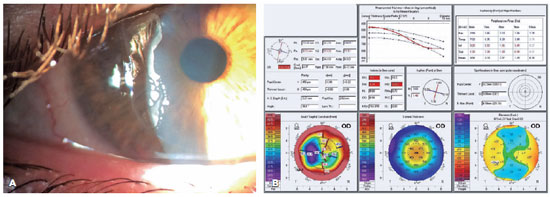 Pentacam corneal tomography (Oculus, Germany) was performed in both eyes. This procedure revealed OD with a flat and irregular cornea with astigmatism ranging from 28D to 38D at the pupil area, which explains the development of monocular diplopia (Figure 1B).
