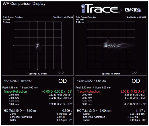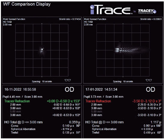 Therefore, in the fifth month after TransPRK, the patient was subjected to an uneventful phacoemulsification with implantation of a toric monofocal IOL, thereby resulting in an uncorrected VA (UCVA) of 20/20p with minimal monocular diplopia and comfortable binocular VA. Aberrometry using the point spread function (high-order) was used to confirm improvement after all treatments (Figure 4).