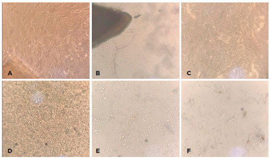 The culture of explants in flasks with hydrophilic surface treatment allowed a strong adherence of explants, which did not detach during the nutrient medium exchanges, as seen in cultures in flasks without surface treatment. It also resulted in a high yield of CM, as it was collected until the third cell passage.