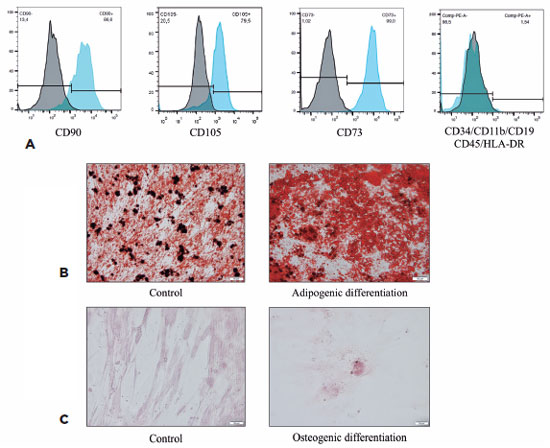 Phenotypic characterization using flow cytometry demonstrated that the analyzed cells were compatible with populations of MSCs, as identified by the characteristics of cell size and granularity. The analyzed cells (Figure 2A) showed high expressions of CD73 (96.1%), CD105 (75.4%), and CD90 (83.5%) and absent or very low expressions of CD34, CD45, CD11b, CD19, and HLA-DR (average, 1.54%). The human MSC population must be highly positive for the surface markers CD73, CD90, and CD105 when measured using flow cytometry. In addition, the markers CD34, CD45, and CD14 must be expressed in less than 2% of the cell population(14); this was used to identify potential contaminants, including hematopoietic stem cells.