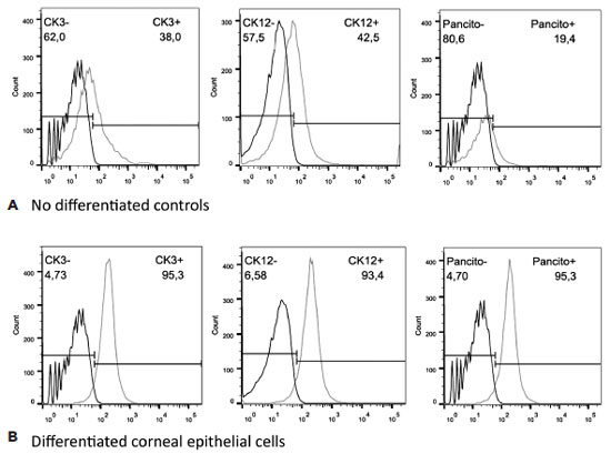 After the MSC differentiation and induction into corneal epithelial cells using the CM, the flow cytometry analysis revealed that the induced cells were CEC, as demonstrated by the expression of corneal cytokeratin-specific markers for CK3 (95.3% of positive cells vs 38% for the control), CK12 (93.4% vs 42.5% for the control), and pan-cytokeratin (95.3% vs 19.4% for the control), confirming the effectiveness of the cell differentiation protocol.