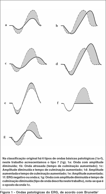 Na primeira parte do trabalho descrevemos um novo tipo de onda do eletrorretinograma (ERG) que deu nome a esta distrofia macular. Sugerimos então, uma complementação da classificação de Brunette das alterações das ondas do ERG, incluindo esta onda caracterizada por resposta rápida e amplitude diminuída. A distrofia retiniana com onda rápida escotópica (DRORE) associada à síndrome dos cabelos anágenos frouxos (SCAF) pode ser incluída no sétimo tipo de ondas patológicas do ERG(2) (figura 1), ou no padrão VIII da classificação dos padrões básicos de ERG patológicos(3) (tabela 1).