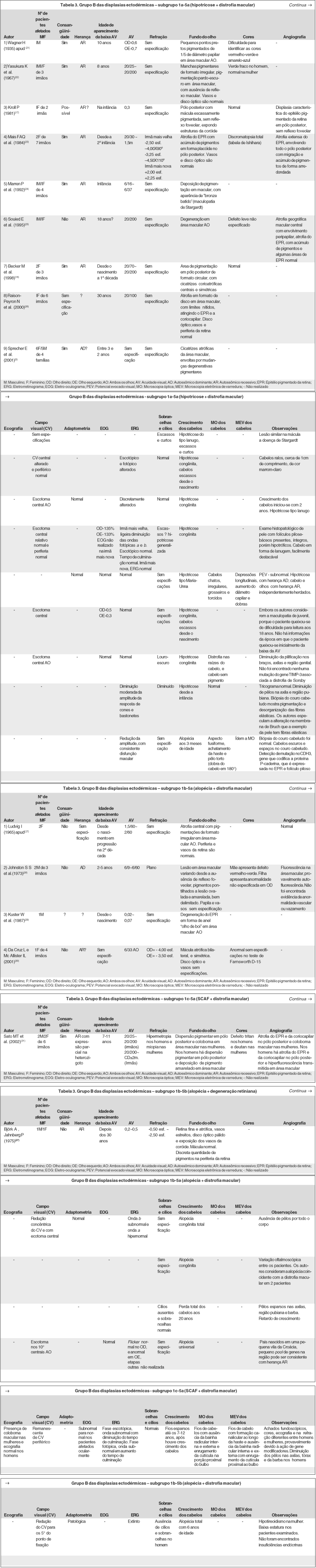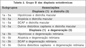 A análise desta classificação mostra que a maioria dos relatos são do subgrupo 1a 5a (hipotricose e distrofia macular), de herança autossômica recessiva (em geral de pais consangüíneos), cujos pacientes apresentaram cílios e sobrancelhas normais e hipotricose de origem congênita. Nos subgrupos 1a 5b (hipotricose e degeneração retiniana) e 1c 5b (SCAF e degeneração retiniana), não se encontram relatos na literatura médica até o presente momento. Fica em aberto uma possível complementação desses subgrupos no futuro, bem como outros tipos de distúrbios capilares associado à distrofia macular e degeneração retiniana (subgrupos 1d 5a e 1d 5b). Assim sendo, temos no grupo B das displasias ectodérmicas os seguintes subgrupos descritos (tabela 3).