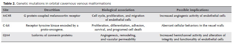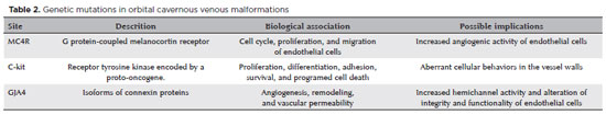 In the periorbital region, mutations are observed in genes that play an important role in pathways involved in angiogenesis, vascular cell growth, apoptosis, and proliferation, mainly in the RAS/mitogen-activated protein kinase pathway/extracellular signal-regulated kinase (RAS/Raf/MEK) and the p53/mTOR pathway. Mutations in genes that are possibly involved in these pathways, such as MC4R, c-Kit, and GJA4, have been found in cavernous lesions in the orbital region(94,99-100). Table 2 summarizes the main genetic mutations related to cavernous vascular lesions.