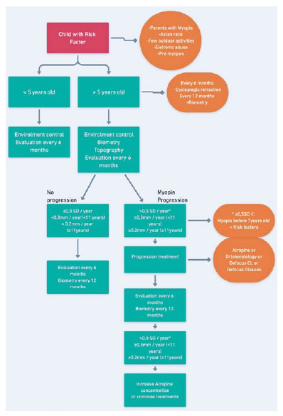 Based on the current scientific evidence and the consensus of the professionals involved in developing the guidelines and the Brazilian reality, a flowchart has been created for the follow-up and control of myopic children (Figure 1).