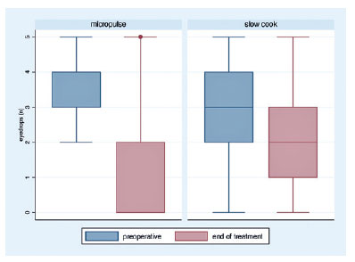 The mean preoperative eye drops used were 3.44 ± 1.38 and 2.89 ± 0.68 drugs in the MP- and SC-TSCP groups, respectively (p=0.017). The mean eye drops used at the end of the study were 2.06 ± 1.42 and 1.02 ± 1.46 in the SC- and MP-TSCP groups, respectively (p<0.001). The eyedrops reduction variation was 2.38 ± 1.55 and 0.82 ± 1.686 in the MP- and SC-TSCP groups, respectively (p<0.001; Figure 2).