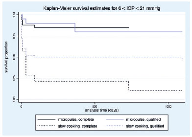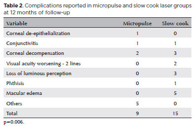 RESULTS: We included 128 eyes with primary open-angle glaucoma. The preoperative mean intraocular pressure was 25.53 ± 6.40 and 35.02 ± 12.57 mmHg in the micropulse- and “slow cook” transscleral cyclophotocoagulation groups, respectively (p<0.001). The mean intraocular pressure was reduced significantly to 14.33 ± 3.40 and 15.37 ± 5.85 mmHg in the micropulse- and “slow cook” transscleral cyclophotocoagulation groups at the last follow-up, respectively (p=0.110). The mean intraocular pressure reduction at 12 months was 11.20 ± 11.46 and 19.65 ± 13.22 mmHg in the micropulse- and “slow cook” transscleral cyclophotocoagulation groups, respectively (p<0.001). The median preoperative logMAR visual acuity was 0.52 ± 0.69 and 1.75 ± 1.04 in the micropulse- and “slow cook” transscleral cyclophotocoagulation groups, respectively (p<0.001). The mean visual acuity variation was -0.10 ± 0.35 and -0.074 ± 0.16 in the micropulse- and “slow cook” transscleral cyclophotocoagulation, respectively (p=0.510). Preoperatively, the mean eye drops were 3.44 ± 1.38 and 2.89 ± 0.68 drugs in the micropulse- and “slow cook” transscleral cyclophotocoagulation groups, respectively (p=0.017), but those were 2.06 ± 1.42 and 1.02 ± 1.46 at the end of the study in the slow cook” and micropulse transscleral cyclophotocoagulation groups, respectively (p<0.001). The success of criterion A was not significant between both groups. Compared with 11 eyes (17.74%) in the slow cook” transscleral cyclophotocoagulation group, 19 eyes (28.78%) in the micropulse transscleral cyclophotocoagulation group showed complete success (p=0.171). For criterion B, 28 (42.42%) and 2 eyes (3.22%) showed complete success after micropulse- and slow cook” transscleral cyclophotocoagulation, respectively (p<0.001).