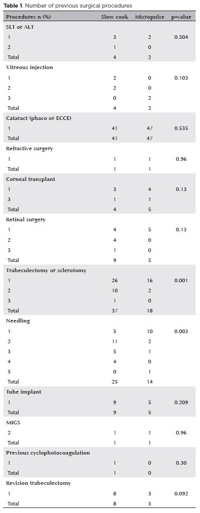 Both groups underwent several previous surgical procedures. The SC-TSCP group had a greater number of patients undergoing previous trabeculectomy and needling. However, other procedures showed no statistical difference between the two groups (Table 1). The total amount of energy was 213.22 ± 45.01 and 143.94±30.22 J in the MP- and SC-TSCP groups, respectively (p=0.001).