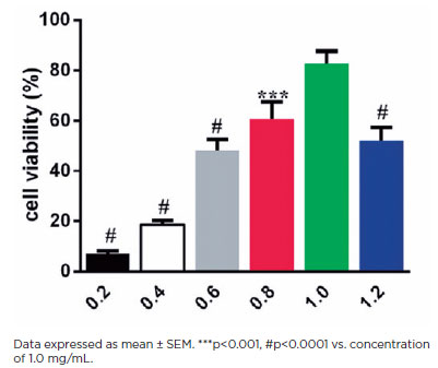 The viability of HLEB3 cells treated for 24 h with increasing HA concentrations was examined through the CCK-8 assay (Figure 1). The HLEB3 cell survival rate increased with increasing HA dosage. Cell viability peaked at 1.0 mg mL−1HA and declined with 1.2 mg mL−1HA (p<0.0001), suggesting cytotoxicity beyond this dose range. Thus, 1.0 mg mL−1 HA was used as the max effective dose to test for downstream effects in subsequent studies.