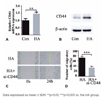 The binding of HA to CD44 extracellular domains induces cell proliferation and migration(18), thereby suggesting a mechanism through which HA triggers pathological cell proliferation in PCO. Cell treatment with HA for 24 h increased CD44 levels, as is evident from the qPCR data (Figure 3A), which exhibited an increase in CD44 mRNA levels. Correspondingly, CD44 protein induction was exhibited by western blotting (Figure 3B). Next, we evaluated the ability of CD44-siRNA to modulate HA-induced HLEB3 cell migration. In the cell scratch assay, CD44 knockdown strongly suppressed HA-induced HLEB3 cell migration (Figures 3C and 3D), which confirmed that HA acts through CD44 to modulate cell responses to wound healing. These findings suggest that HA induces the expression of its receptor CD44 in HLEB3 cells and that CD44 mediates the effect of HA on cell growth and migration.