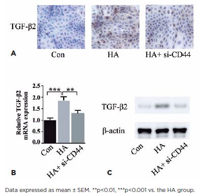 RESULTS: Treatment with hyaluronic acid (1.0 μM, 24 h) increased the epithelial–mesenchymal transition of HLEB3 cells. The increase in TGF-β2 levels corresponded to an increase in CD44 levels in the culture medium. However, blocking the CD44 function significantly reduced the TGF-β2-mediated epithelial–mesenchymal transition response of HLEB3 cells.