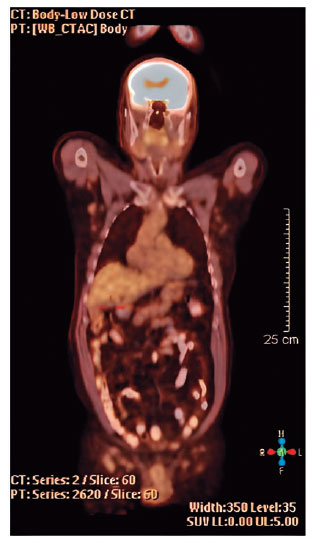 Histopathological and immunohistochemical findings revealed classical MCL (Figure 2). The patient was referred to the oncology department. Additional tests such as those for liver function, erythrocyte sedimentation rate, blood urea nitrogen level, creatinine level, β2 microglobulin level, lactate dehydrogenase level, leukocyte count, whole-body positron emission tomography (PET) (Figure 3), and bone marrow biopsy were performed.