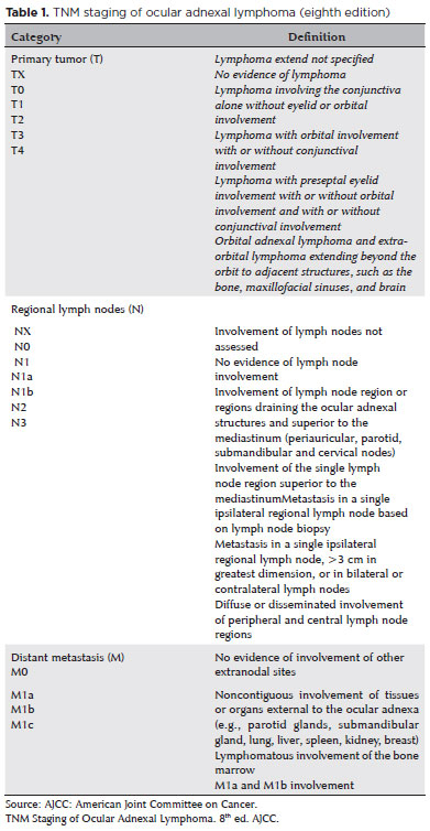 The PET scan revealed multiple lymphadenopathies in the mediastinum, axillary fossa, and infra- and supra-diaphragmatic paraaortic areas. Bone marrow examination revealed involvement of the bone marrow. The patient was classified as having T4N3M1c disease according to the TNM staging system for ocular adnexal lymphoma (Table 1).