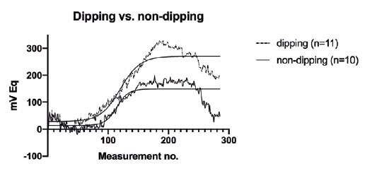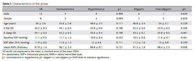 The lack of difference in RNFL thickness between the dippers and non-dippers in our study is contradictory to the aforementioned findings. However, these results should be interpreted cautiously, as our patient group was relatively young (49 years vs. the average age of glaucoma diagnosis in most studies, 60-70 years) and did not include glaucoma patients(21).