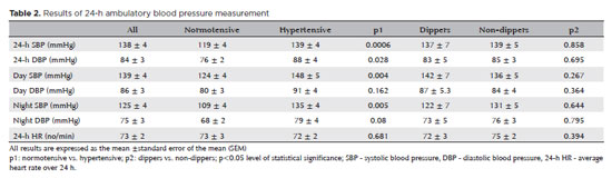 Upon further analysis, we noted that dippers had a significantly higher 24-h ocular volume slope (p=0.004) and mean nocturnal CLS output (p=0.041) than non-dippers (Figure 1, Table 3). By contrast, no significant differences in these parameters were observed between the normotensive and hypertensive patients (p=0.285 and p=0.991, respectively) (Figure 2, Table 3). Moreover, no significant differences in mean day-time CLS output, variability of the mean, or the number of peaks over 90 mVEq were detected between the non-dippers and dippers, or between the normotensive and hypertensive patients (Table 3).