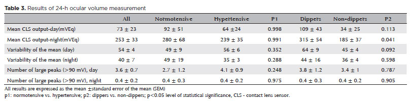 RESULTS: A total of 21 patients, including 7 normotensive and 14 treatment-naive hypertensive individuals, were included in the study. of them, 11 were dippers and 10 were non-dippers. No significant difference in the 24-h ocular volume slope was observed between the hypertensive and normotensive patients (p=0.284). However, dippers had a significantly higher 24-h ocular volume slope (p=0.004) and nocturnal contact lens sensor output (p=0.041) than non-dippers.