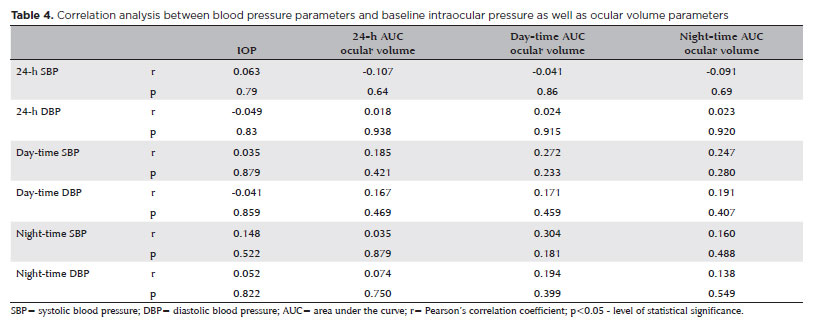 The correlation analysis (Table 4) revealed no significant relationships between 24-h SBP, 24-h DBP, day-time SBP, night-time SBP, day-time DBP, night-time DBP, and IOP, as well as 24-h, day-time, and night-time area under the curve (AUC) of the ocular volume. Furthermore, RNFL thickness and 24-h AUC of the ocular volume exhibited no significant correlation (p=0.852).