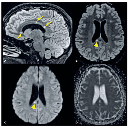 For diagnosis, typical brain magnetic resonance imaging (MRI) findings are also required. These include fluid-attenuated inversion recovery (FLAIR) and T2 hyperintense, small, round multifocal snowball-like lesions of the white matter, at least one of which is in the corpus callosum. Leptomeningeal enhancement may also be observed.
