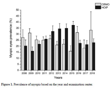 PURPOSE: This study aimed to examine the prevalence of myopic eyes over 11 years (2008-2018) in a private clinic and a public assistance service.