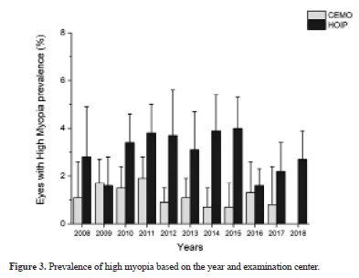 During the study period (2008-2018), the prevalence of high myopia significantly reduced in the CEMO (Kendall tau=-0.50, p=0.0344) but not in the HOIP (Kendall tau=0.04, p=0.88). Considering the entire study period, the prevalence of high myopia was significantly different between CEMO (1.3%, 1.0%-1.6%) and HOIP (3.0%, 2.6-3.4) (p<0.0001).