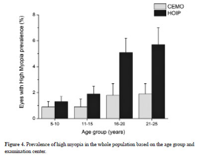 Table 3 and Figure 2 show that the prevalence of myopia increases as age increases, and the difference was statistically significant between the two groups, which was consistent with other studies(10). However, such an increase was approximately the same when the CEMO and HOIP were compared.