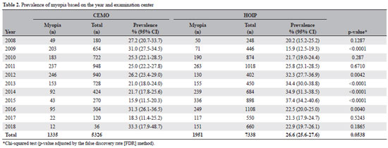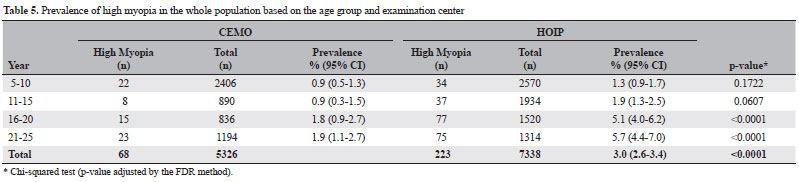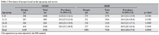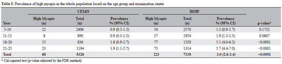 An association was found between the age group and the prevalence of high myopia in both services (CEMO, p=0.0257; HOIP, p<0.0001).
