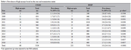 Table 4 and figure 3 show the annual prevalence of high myopia in each examination center.