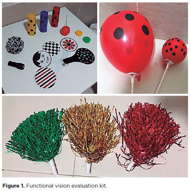 Functional vision was assessed according to cerebral visual impairment (CVI) evaluation(6). Seven characteristics of CVI behavior were analyzed: 1) visual latency; 2) color preference; 3) eye tracking of moving objects; 4) visual field preferences; 5) photophobia; 6) light gazing and staring at lights; and 7) visual response to near and distant objects (at 40 and 100 cm, respectively). Customized materials to evaluate the CVI characteristics were as follows: red with black dots, green and yellow balloons, and laminated pompons (Figure 1).