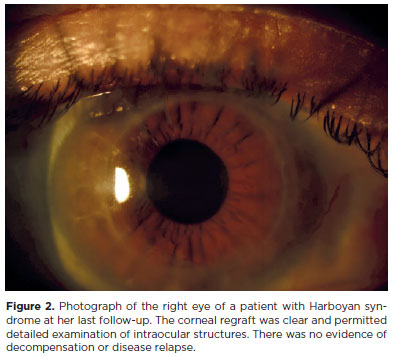 A 37-year-old woman presented at the Dokuz Eylül University Department of Ophthalmology Cornea Clinic with visual loss in her right eye, in which she had undergone corneal graft surgery 20 years earlier. Our examination revealed best corrected visual acuity of 3 logMAR and 0.3 logMAR in the right and left eyes, respectively. The left eye had a clear graft with no signs of decompensation, although the central corneal thickness was 574 µm (Figure 1). The intraocular pressure (IOP) was 15 mmHg in the right eye and 16 mmHg in the left.
