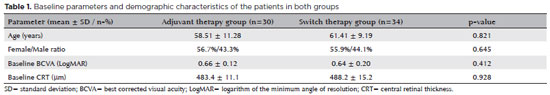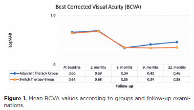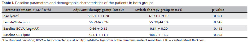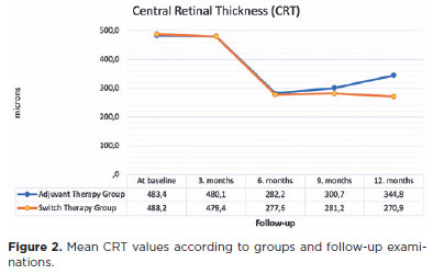 RESULTS: In this study that included 64 eyes of 64 patients, the best corrected visual acuity and central retinal thickness values did not significantly differ between the groups at baseline and at 6 months of follow-up (p>0.05). However, at 12 months, the best corrected visual acuity values in the adjuvant and switch therapy groups were 0.46 and 0.35 LogMAR, respectively (p=0.012), and the central retinal thickness values were 344.8 and 270.9, respectively (p=0.007).