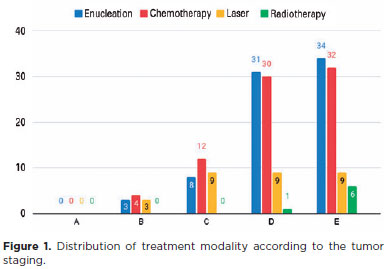 The global approach to patients with Rb is timely tumor diagnosis, appropriate treatment strategies, and clinical follow-up to identify possible recurrences(1). Currently, the treatment modalities available are aimed at preserving the patient's life, which entails prevention of extraocular invasion(1,21). Depending on the location and extent of tumor involvement, enucleation, different chemotherapy combinations, laser therapy, cryotherapy, or radiation may be considered(2).