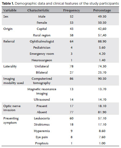 RESULTS: The data of 105 patients were included in the study, and the mean patient age at the time of diagnosis was 1.7 years. Most of the patients were women (50.5%) and hailed from rural areas (57.4%), which was associated with a higher tumor stage. Of the 150 patients, 57.1% initially presented with leukocoria. Ocular hyperemia was associated with more advanced stages of retinoblastoma (p=0.004). Bilateral involvement was observed in 25.7% of the patients and at a significantly younger age (p=0.009). The presence of retinal detachment, vascularized lesions, and vitreous seeds significantly increased the likelihood of requiring enucleation.