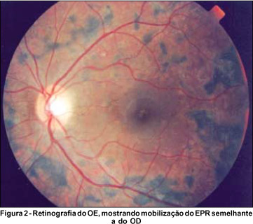 Não apresentava queixas oculares. Sua acuidade visual era de 1,0 em ambos os olhos. A biomicroscopia e a tonometria eram normais, assim como o exame da grade de Amsler e o teste de Ishihara. Na fundoscopia, foram evidenciadas diversas áreas de hiperpigmentação no pólo posterior em ambos os olhos (Figuras 1 e 2), que na angiografia fluoresceínica representavam moteamento do EPR (Figuras 3 e 4).